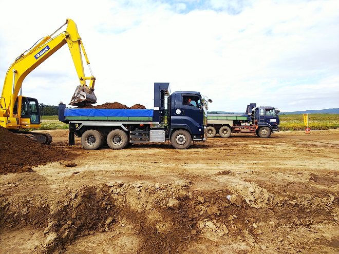 この日は移動式クレーンで土砂の積み込み、ダンプで運搬の繰り返し。